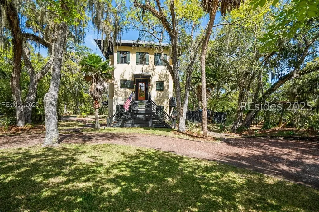 This one-of-a-kind home is a nature lover's dream & a MUST SEE! Hidden between the Live Oaks of Dolphin Point on Cat Island, you'll find this eclectic, four-story home featuring reclaimed heart pine floors, exposed wooden beams & nearly 2,000 square feet of porches perfect for Lowcountry living. The estate features tons of natural landscapes, wooded & pond views, gardens, & living fenced in yard. Wind down on the giant screened-in porch w/ wood-burning fireplace, listen to the rain hit the metal roof or relax in the free-standing soaking tub just off the owner's suite. Open concept 5 bedroom, 4 ½ bath home w/ gourmet kitchen.
