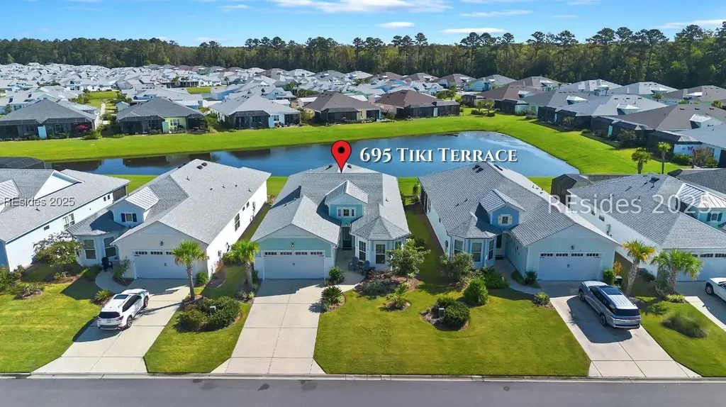 Welcome to 695 Tiki Terrace, a beautifully appointed three-bedroom retreat filled with custom designer upgrades. This home offers an ideal blend of elegance and functionality, perfect for modern living. The den is highlighted by a full wet bar - ideal for entertaining - while a built-in desk, wall-to-wall closets, and a Murphy bed add everyday convenience. Two bedrooms feature en-suite baths, including a spacious primary suite with private patio access. The chef's kitchen showcases stunning granite counters and distinctive gold accents, opening seamlessly to the living and dining areas. Enjoy indoor-outdoor living with expansive sliders leading to a screened lanai and extended patio, perfect for relaxing or entertaining. Some furnishings are available on a separate bill of sale, making this home move-in ready.