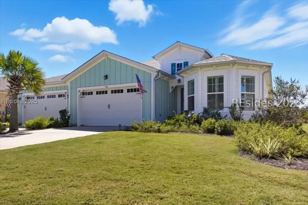 Welcome to lagoon view living in Latitude Margaritaville! This sought-after Nevis villa is ideally located near distance to the Town Center and resort-style amenities. Offering 3 bedrooms, a den, and 2 baths, the open floor plan flows to a screened birdcage with tiled flooring, perfect for morning coffee. Thoughtful upgrades include hardwood floors, Cambria quartz countertops, 42" cabinets with soft-close drawers, crown molding, under-cabinet lighting, and 8 doors with 5.5 baseboards. Enjoy high-end stainless appliances, wood shelving, beams in the primary suite, and plantation shutters with custom window treatments. Additional features include a gas cooktop, pull-down attic stairs, epoxy-finished garage flooring, whole house water filtration system, and whole house surge protector. This home captures the best of Margaritaville style with function and flair.